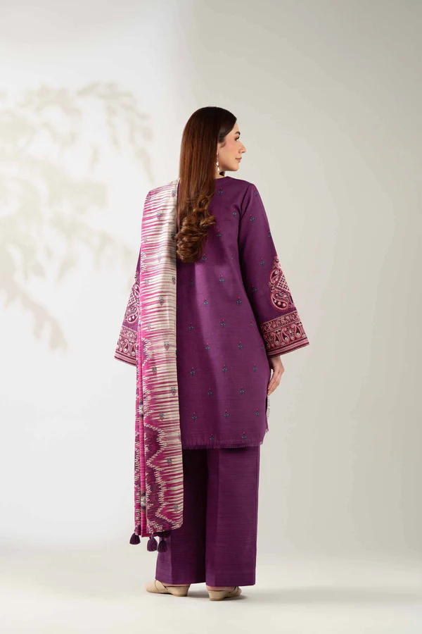 Timeless comfort, cultural artistry with this printed embroidered three-piece from the latest unstitched Winter Collection.